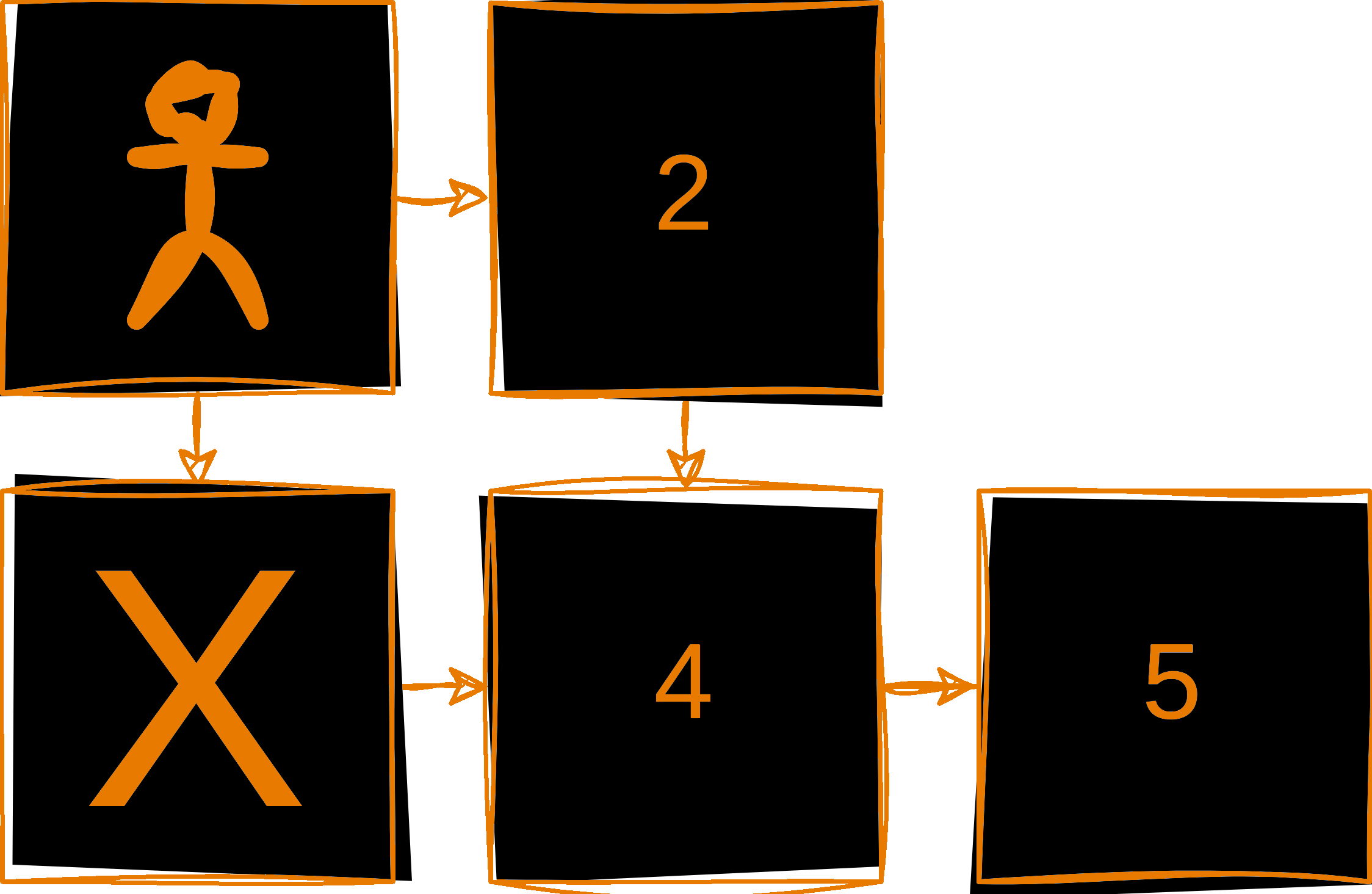 A robot on a small grid needs to get from cell 1 to cell 5. Cell 3 is blocked, so the valid path is 1, 2, 4, 5.